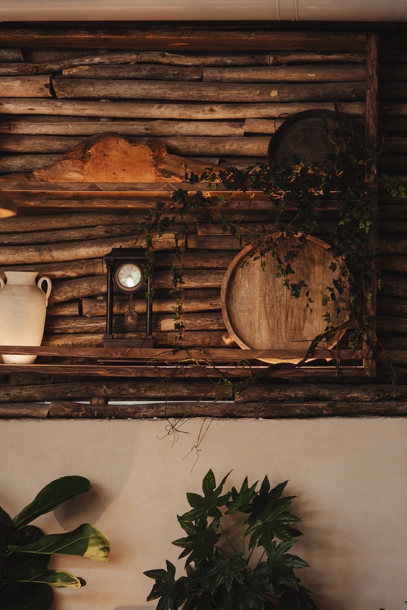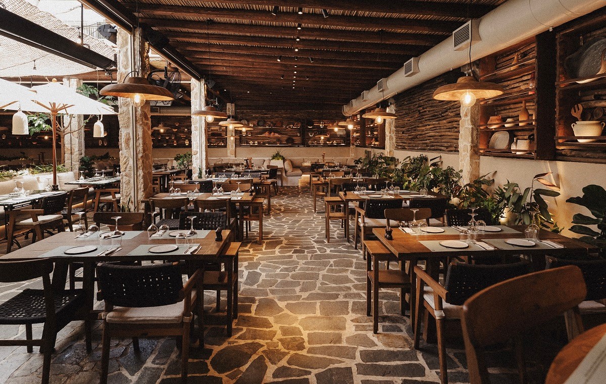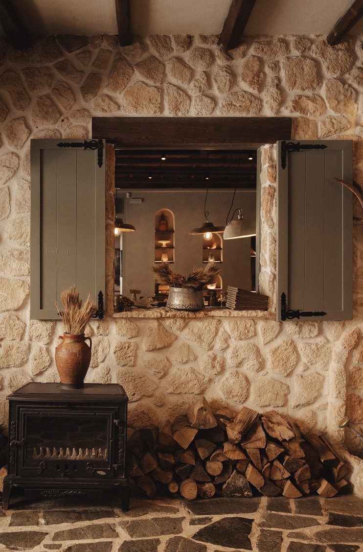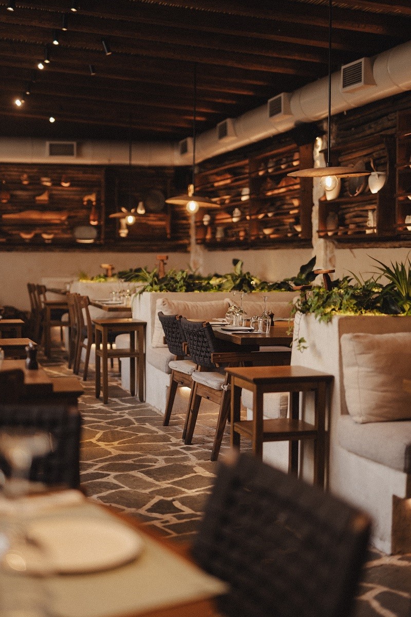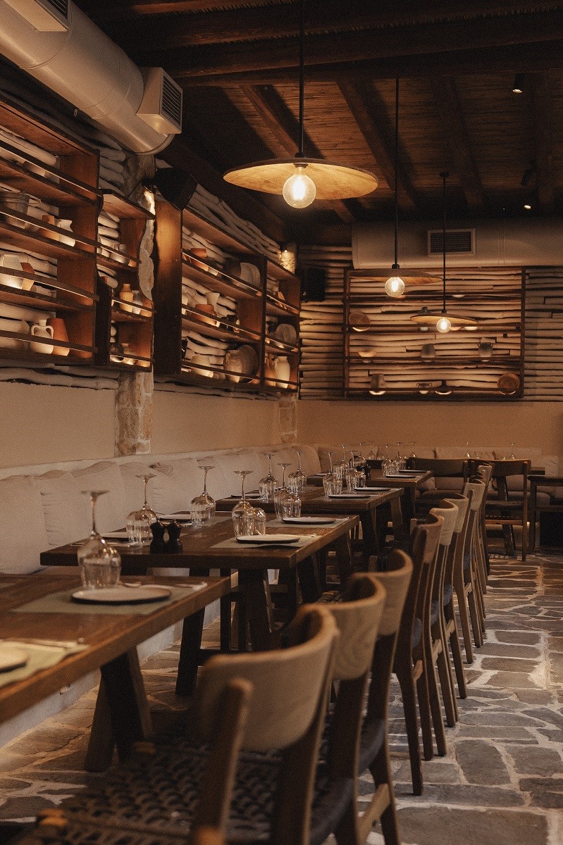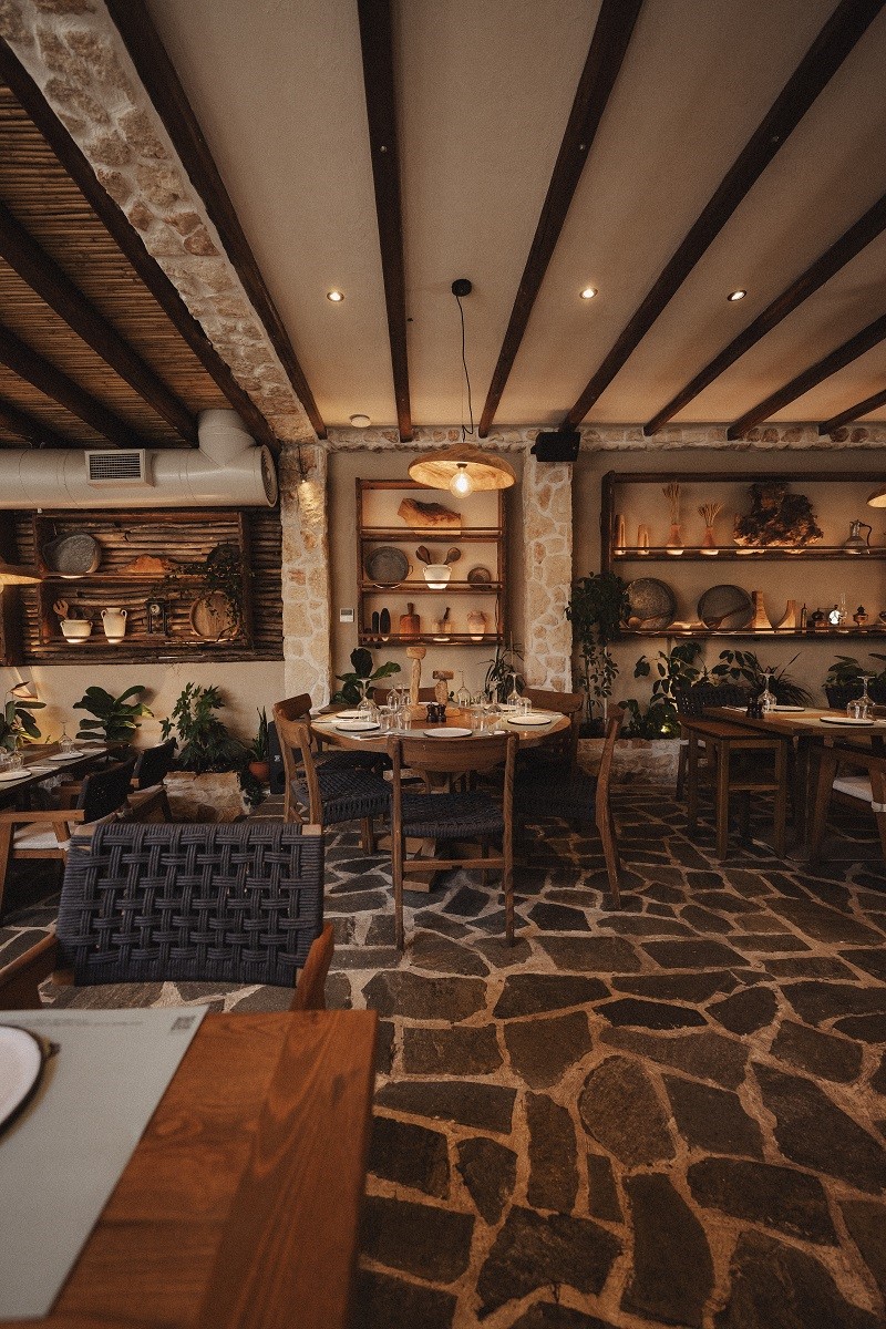 Ο ίδιος ο χώρος και η ατμόσφαιρά του, είναι στα μέτρα ενός σπιτιού χωριάτικου, με το ξύλο και την πέτρα να επικρατούν ως υλικά, στο χώρο, τη διακόσμηση, τα μαγειρικά σκεύη και τα φωτιστικά, τη βρύση, τους χτιστούς άνετους πάγκους με μαξιλάρες και το μπαρ με τα κυκλαδίτικης αισθητικής διακοσμητικά «ανοίγματα» στους τοίχους. Την οικεία, άνετη ατμόσφαιρα, ολοκληρώνει η ελληνική μουσική, που συνοδεύει κάθε γεύμα, είτε στον εσωτερικό χώρο, είτε στην όμορφα διαμορφωμένη αυλή.