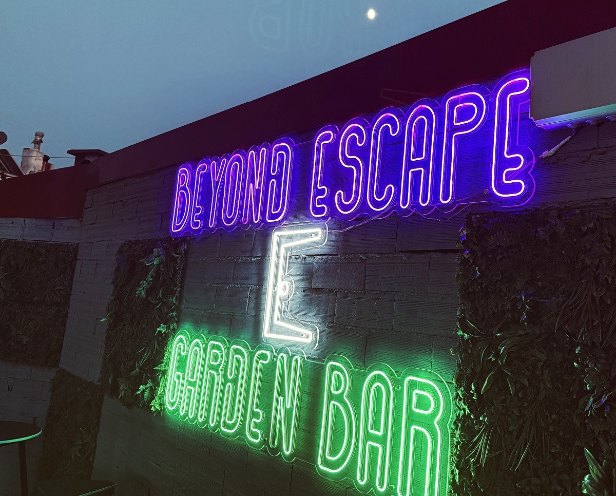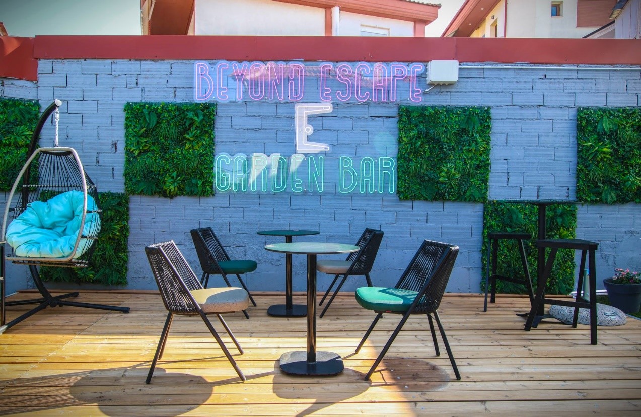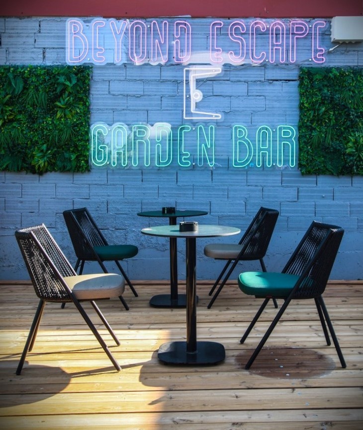 Ο εξωτερικός χώρος του Beyond Escape Garden Bar δίνει άλλη διάσταση στις λέξεις «χαλάρωση» και «διασκέδαση». Είναι ένα μικρό καταφύγιο αισθήσεων. Εδώ, το σκηνικό μεταφέρεται σε έναν κήπο γεμάτο μαξιλάρες, πουφ και ναργιλέδες, ιδανικό για παρέες που αναζητούν κάτι διαφορετικό.