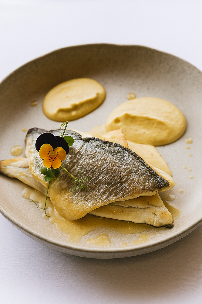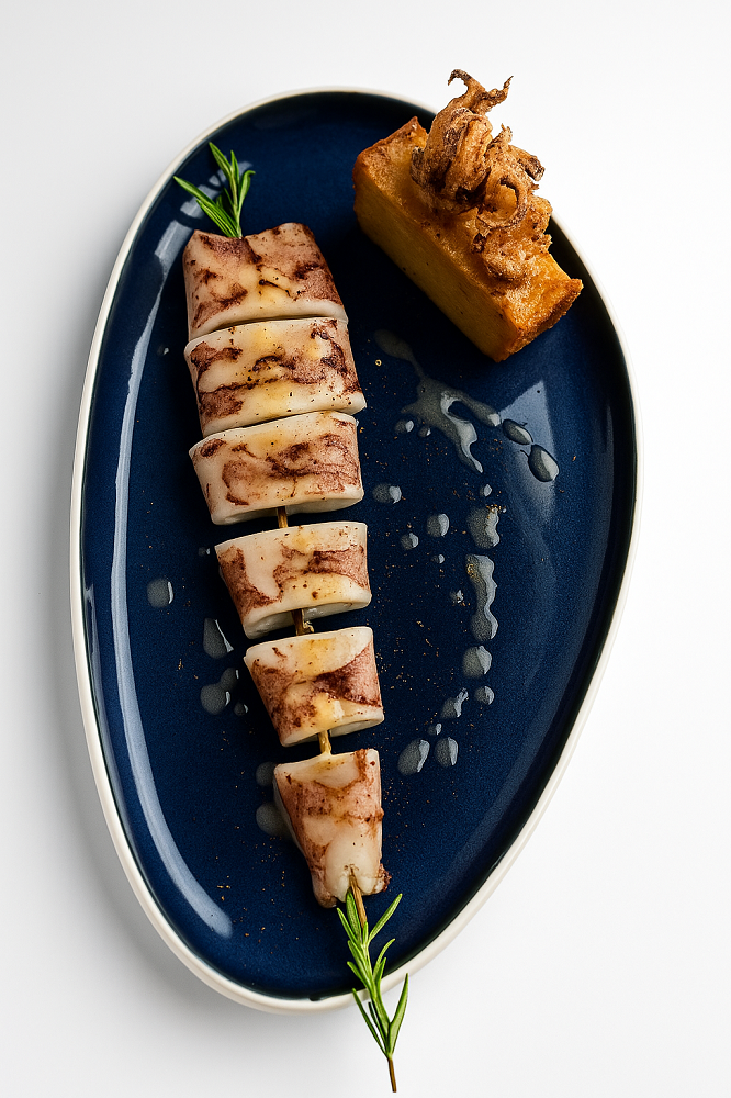Στους χώρους του εστιατορίου, λίγα μόλις μέτρα από το νερό, πιάτα όπως το καλαμάρι σε δύο μορφές – ψητό και τηγανητό – σερβιρισμένο με τραγανή πατάτα πάβε, κρέμα λεμονιού και τρίμμα αβγοτάραχου Μεσολογγίου ή το φιλέτο τσιπούρας με πουρέ ρεβιθιού αρωματισμένο με vadouvan και μια λεπτή lemon emulsion – ένα πιάτο που ισορροπεί την καθαρότητα με την πολυπλοκότητα – μοιάζουν σχεδόν σαν συνέχεια του τοπίου.