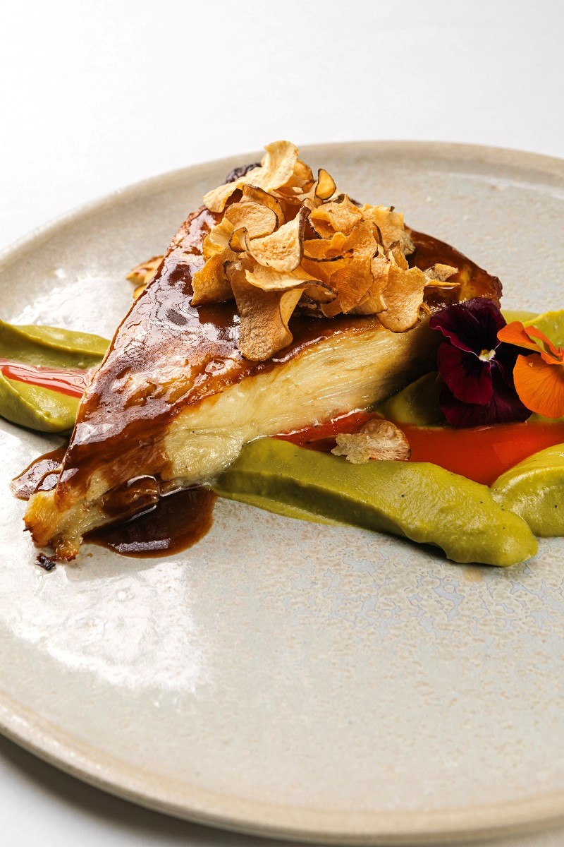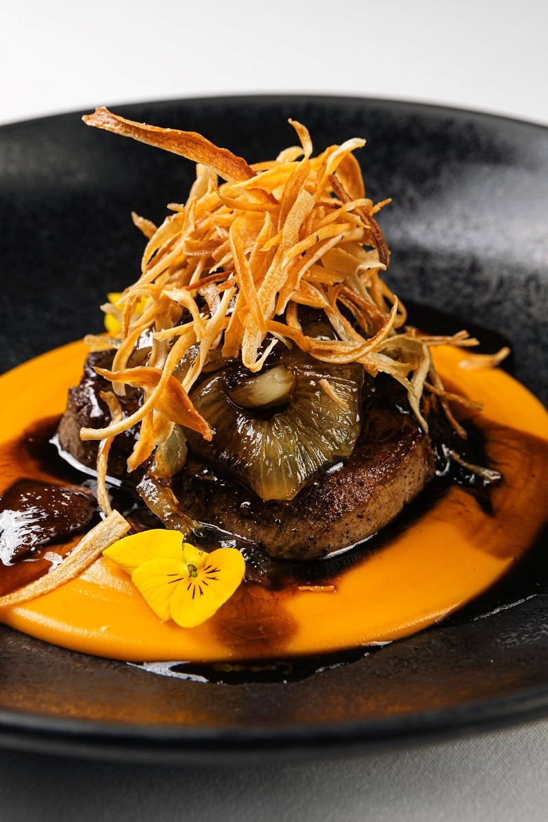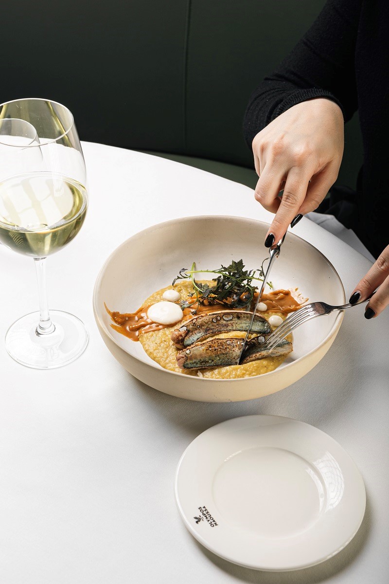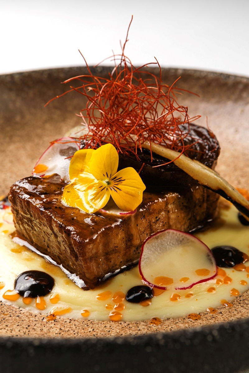 Κάπως έτσι, η μπριζόλα μαύρου χοίρου (Iberico) γίνεται πιάτο που ξυπνά τις αισθήσεις με την αρωματική σάλτσα της, ο μουσακάς παρουσιάζεται με rib eye Black Angus, μιλφέιγ λαχανικών κι αφράτη μπεσαμέλ, το πελαγίσιο λαβράκι εμπλουτίζεται με βινεγκρέτ λεμόνι με σχοινόπρασο.