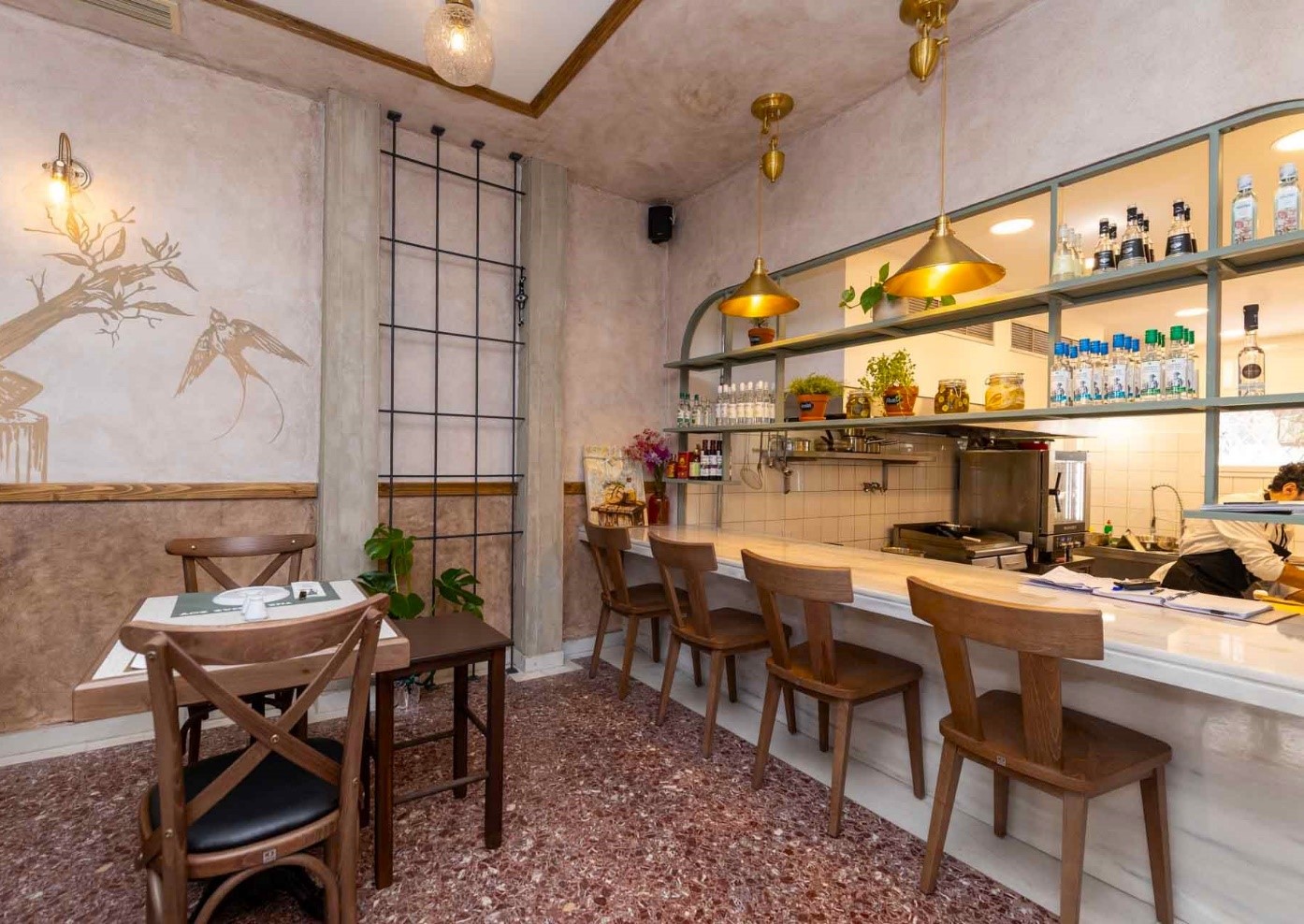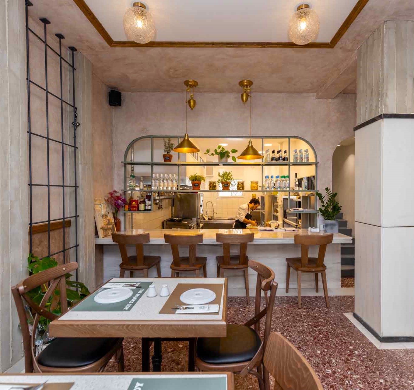 Θα το προσέξετε και μόνο από το όνομά του, όπως θα περνάτε από έξω και θα κρυφοκοιτάξετε μέσα, για να αφουγκραστείτε την ψυχή του νέου αυτού χώρου, που αποπνέει μία παράξενη οικειότητα, σαν να σας… περίμενε από πάντα. Οι κολώνες της αρχικής αρχιτεκτονικής και το απείραχτο μωσαϊκό, ήρθαν να “δέσουν” με μία πιο σύγχρονη αισθητική των ιδιοκτητών, που ήθελαν έναν χώρο με ατμόσφαιρα που να συνδυάζει ένα πιο “δανέζικο” στυλ, που θυμίζει ωστόσο και λίγο από καφενείο.