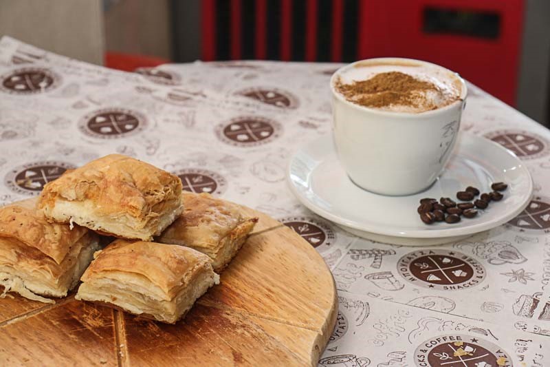 families, locals, and tourists stop by for a fresh bougatsa and a coffee to go