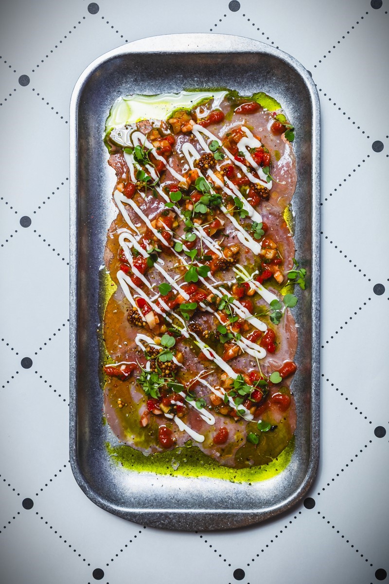 Among the new menu proposals, you will find, in the new category of raw seafood, sea bass carpaccio with aromatic olive oil and lemon and black tarama.