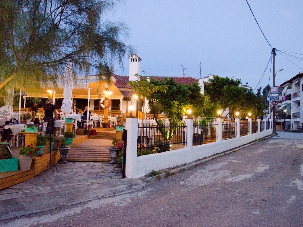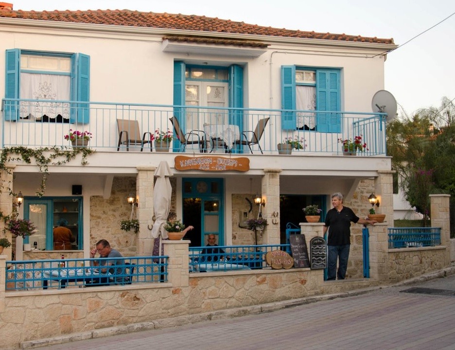 The décor is simple yet full of character, with wooden tables, traditional items, and vintage photos that take you back in time. The outdoor space, overlooking Pefkochori with the sea breeze embracing you, sets the perfect scene for summer nights filled with light, laughter, and good music.
