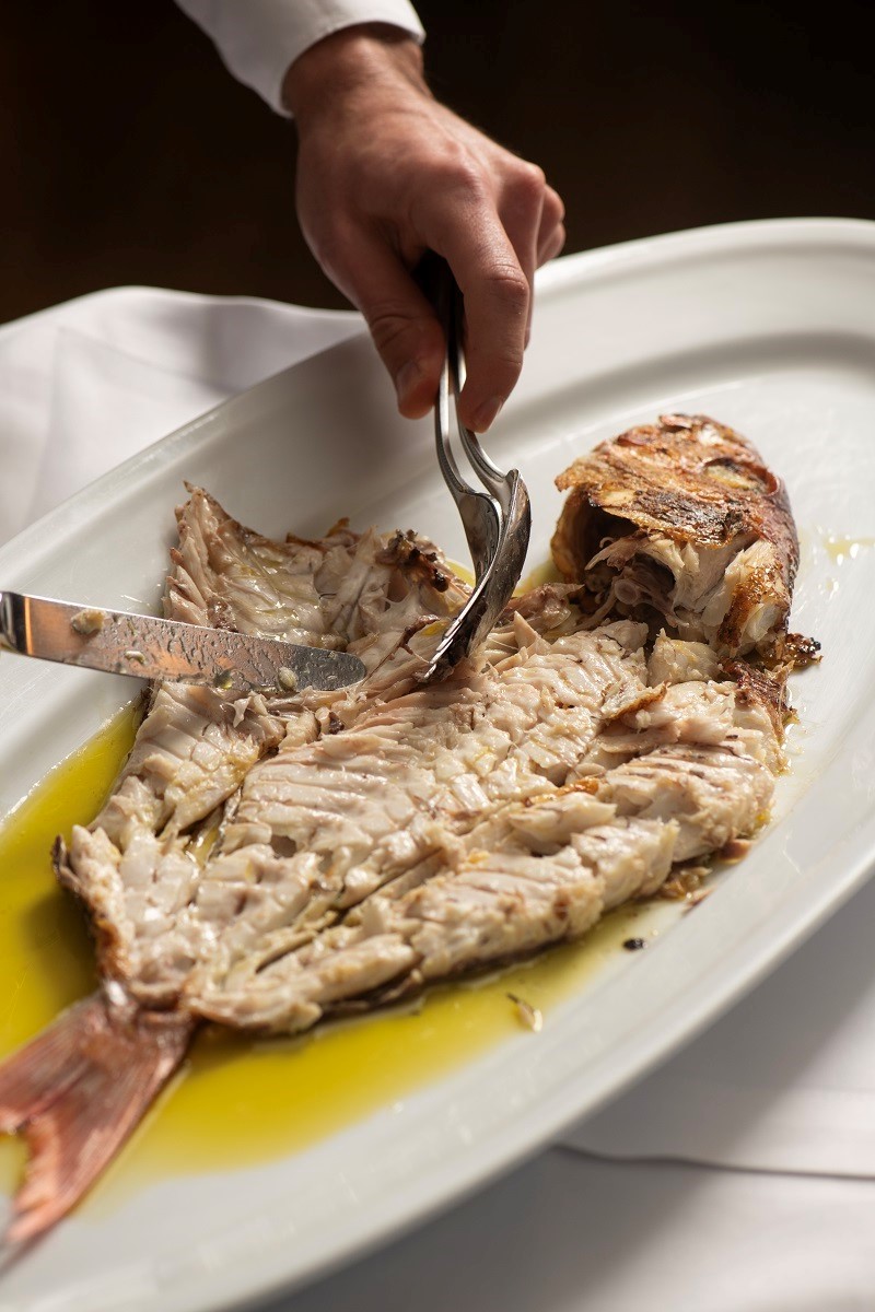 Appetizers include stuffed vine leaves (dolmadakia yalantzi), tzatziki, spicy cheese spread (tirokafteri), or an assortment of Greek cheeses that pair wonderfully with their wine list. Large fish such as red porgy, dentex, sea bream, sea bass, scorpionfish or John Dory, as well as pasta with shrimp, langoustine or lobster, complete the menu beautifully.