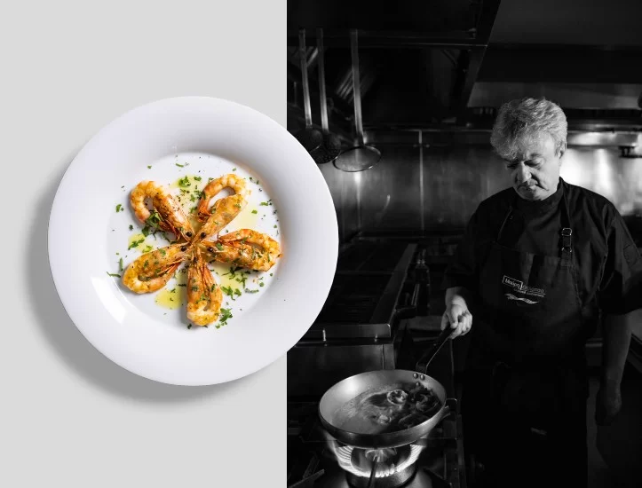 At the heart of the restaurant are the people who have shaped its course. Alexandros Tokidis — known to everyone as Alekos — grew up beside his mother Olga, learning the secrets of spices and fresh ingredients as they prepared at home the meals that would be served in that first coffee shop. A true seafood expert, from the days he first selected fish and seafood at Kapani Market to the point where he came to know all their secrets, he is the “captain” of the kitchen.