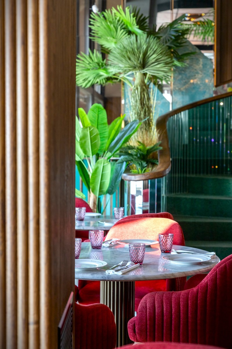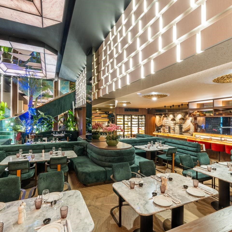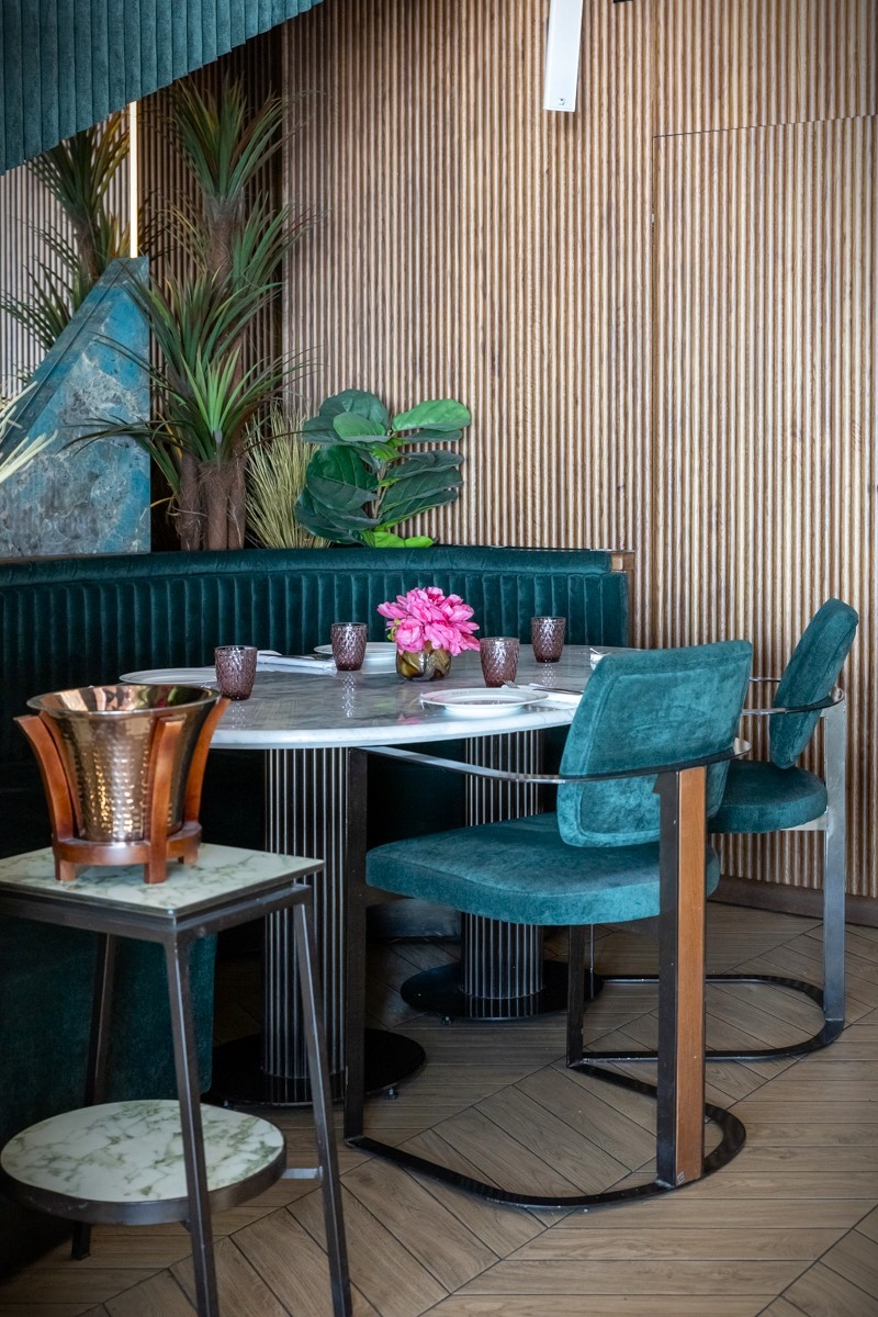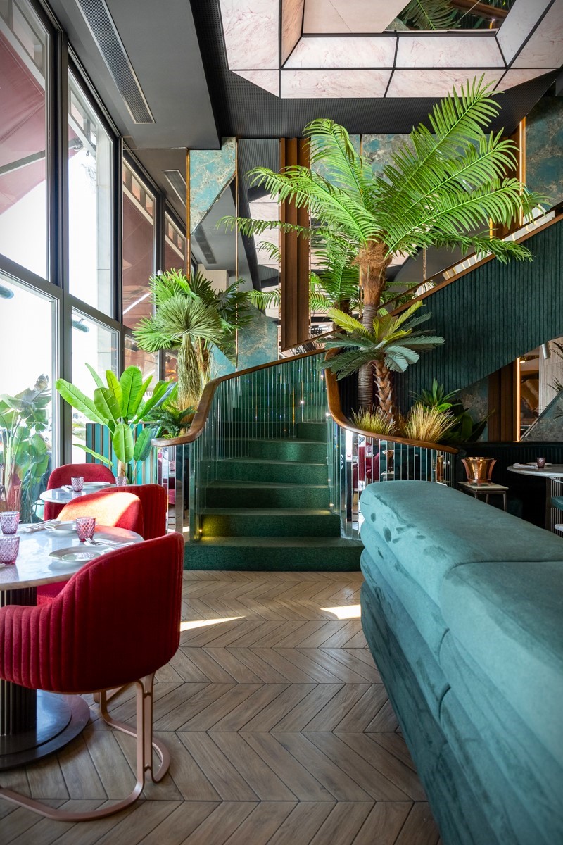 And you, enjoy all this from an impressive space, decorated with tropical plants and impressive chandeliers, emerald shades on the tables and chairs, with a timeless, charming style, which truly stands out both inside and outside, combining elegance and relaxation, at all hours of the day.