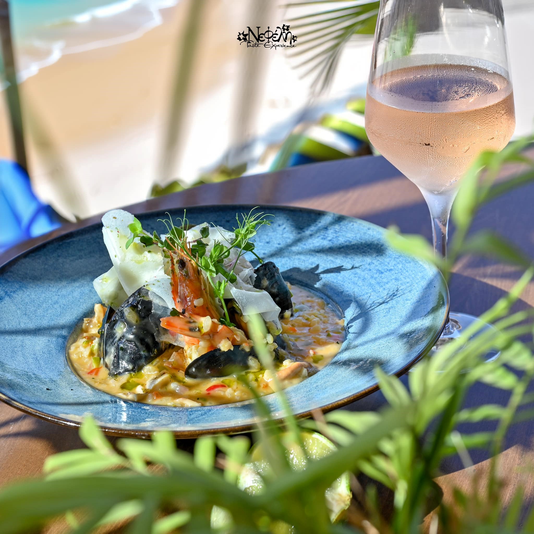 But the experience doesn’t end at the table. In the atmospheric garden or on the organized beach with loungers and beach bar vibes, you can enjoy your meal literally by the waves.
