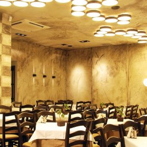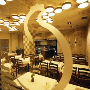 Well-cooked, home-made recipes, which take you back to taste memories, in a warm environment, traditionally decorated with pictures on the walls from Old Thessaloniki, with mosaics by Elsa Tsitouridou, wood painting by Vassilis Mameas of the Greek tradition of Theofilos and engravings, such as and a shadow theater by Karagiozis.