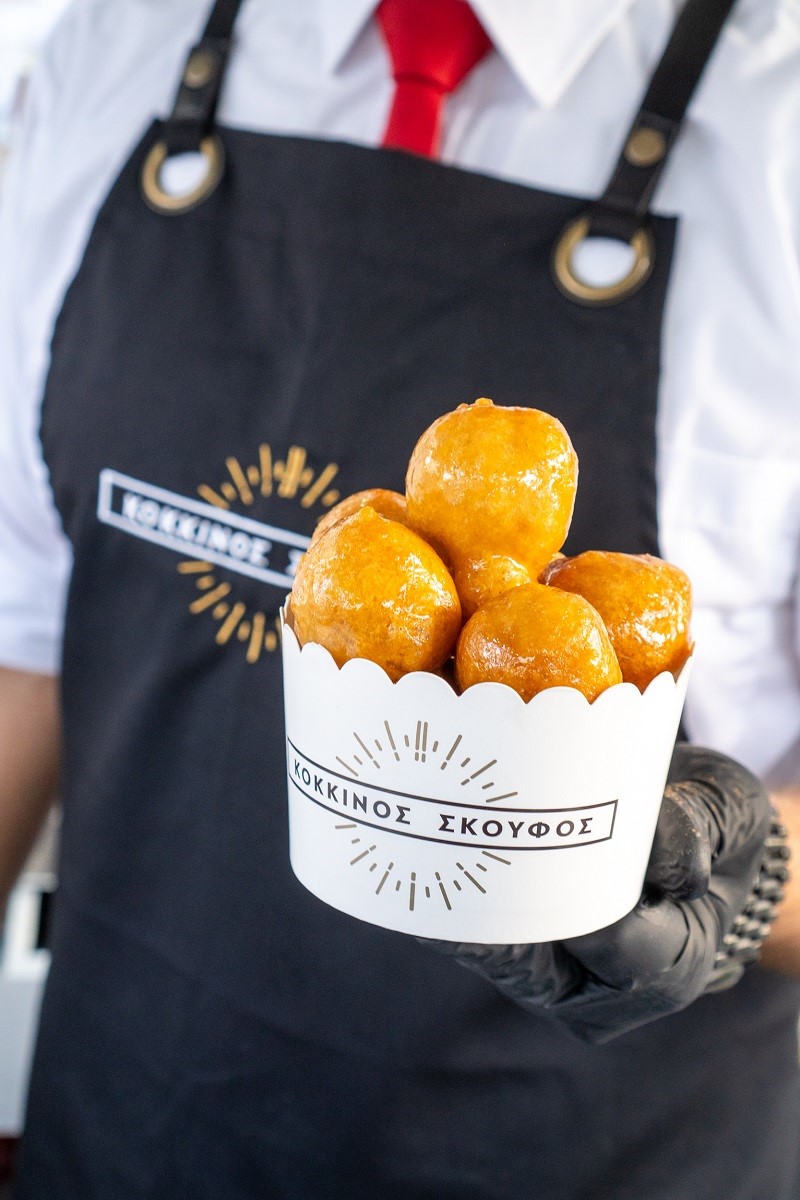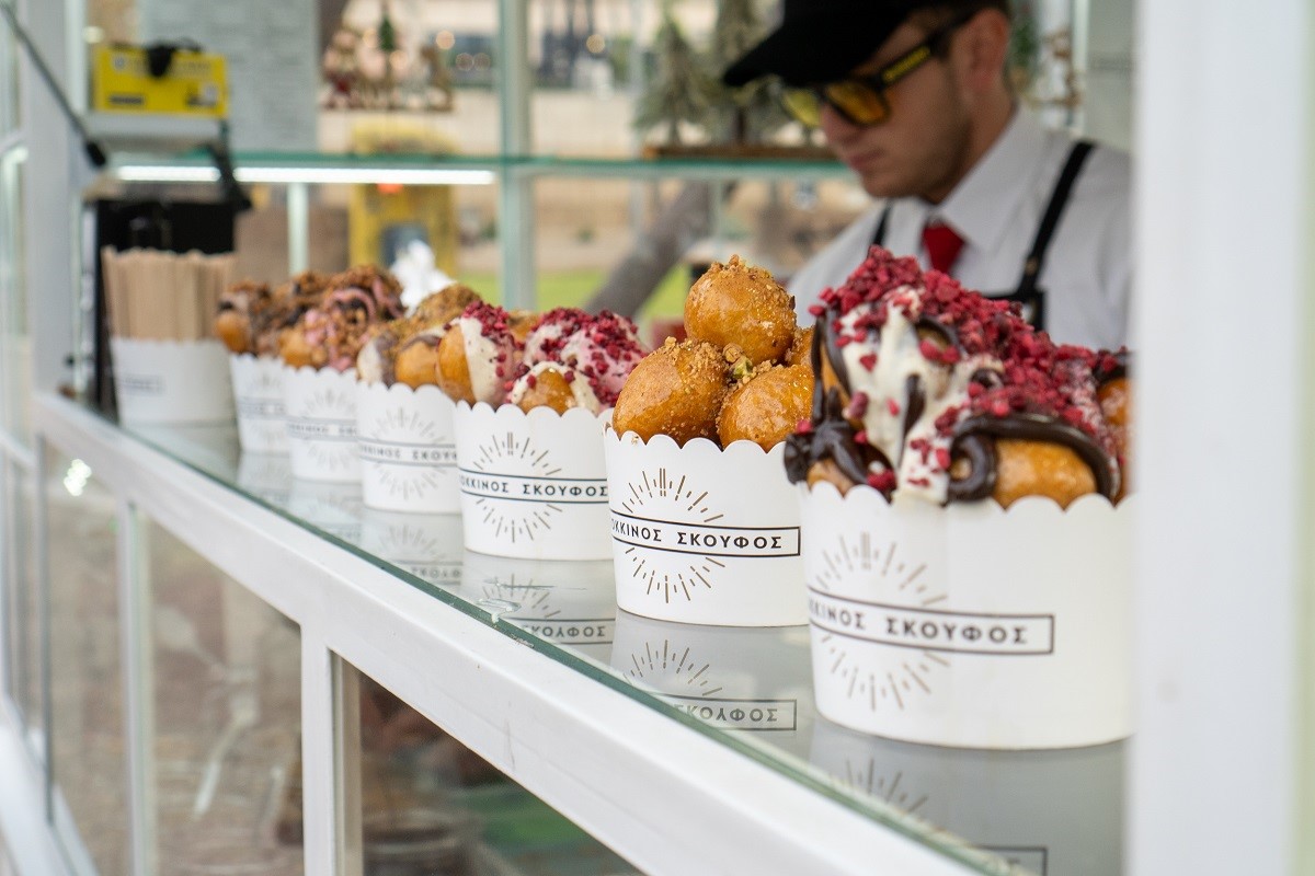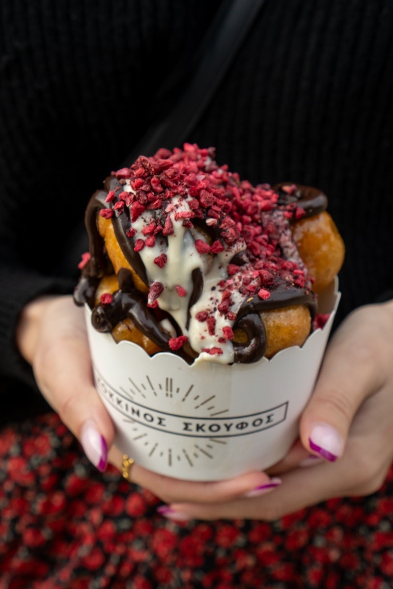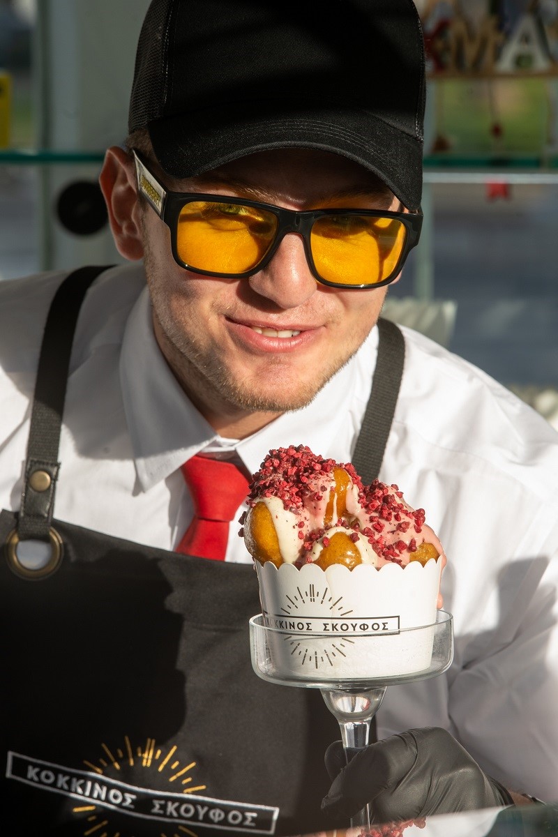 The story of Red Cap began in 2012, when Konstantinos Liapis, in the midst of the economic crisis, decided to take loukoumades—and his family recipe—out onto the street. A small cart with a red-and-white awning appeared next to the Thessaloniki Concert Hall. Above all stood out the pastry chef’s red cap, which ultimately gave the venture its name. An elderly customer once told him, “When you wear the cap, we know the loukoumades are ready.” And so the name remained, marking every step of what was then a brand-new project.