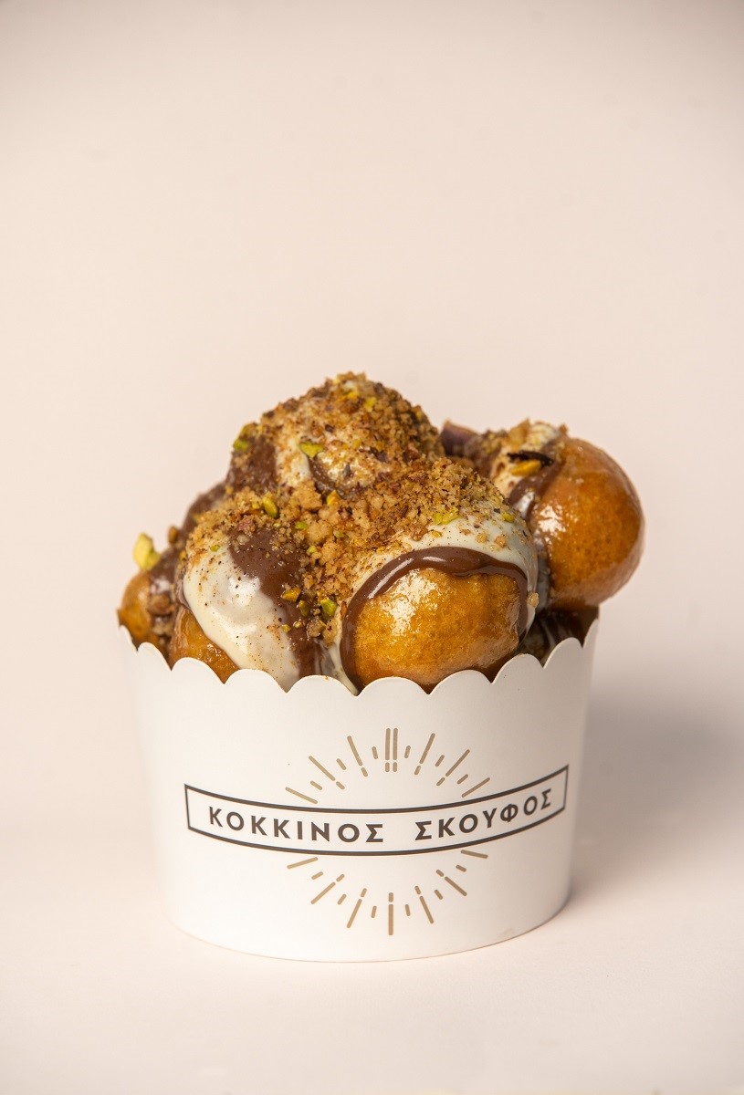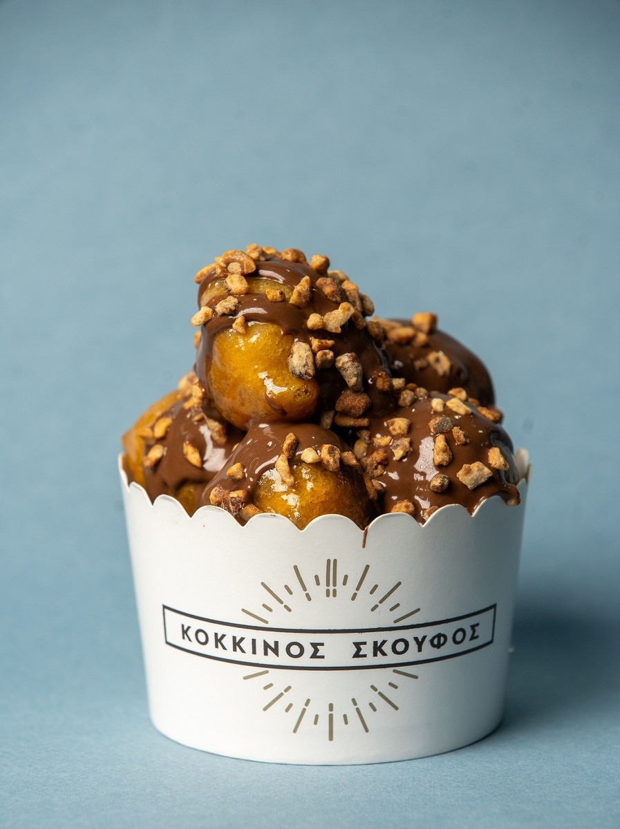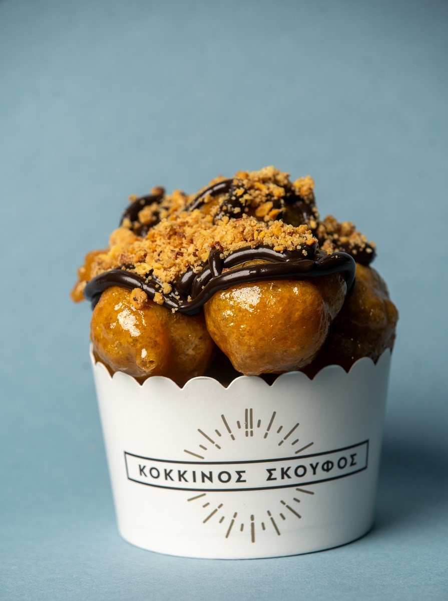 The flavor palette at Red Cap covers every version of this beloved traditional dessert. From classic loukoumades with syrup and cinnamon or blossom honey, to tempting bites with handmade pralines, dark chocolate, strawberry, and vanilla. Filled loukoumades with Ferrero, butter biscuit, Aegina pistachio, or caramelized hazelnut croquant have already gained a devoted following. The menu also includes cookies made with cultured butter and salted caramel, finished with aromatic coarse salt.