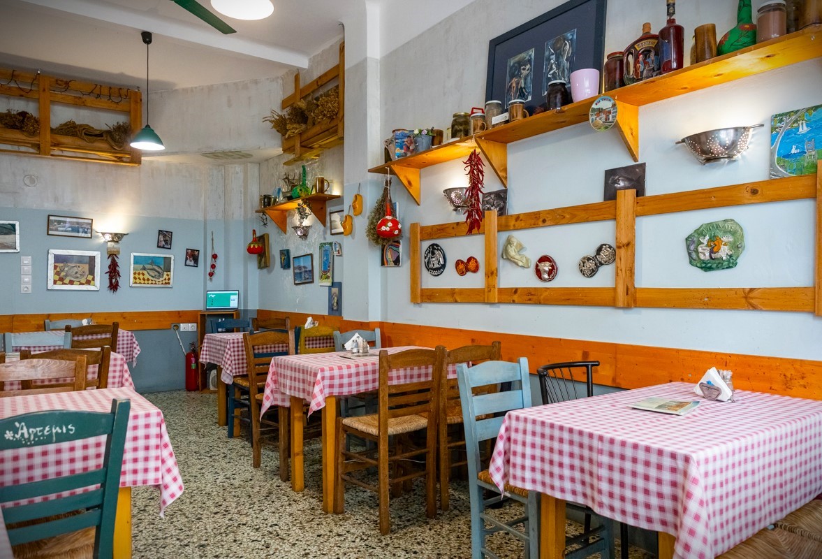 At number 9 on the quiet pedestrian street of Ioannou Dellioú, just down Ippodromiou Street from Kamara on the left, a taverna has been serving flavors and aromas from the island of Lesvos for the past 14 years, along with a wide and carefully selected range of local Greek products.