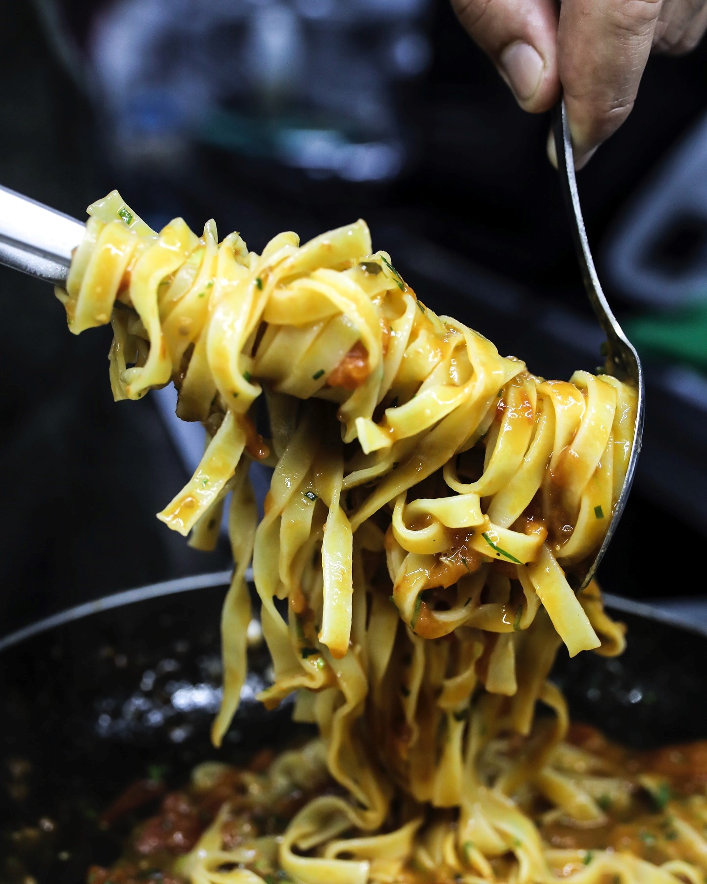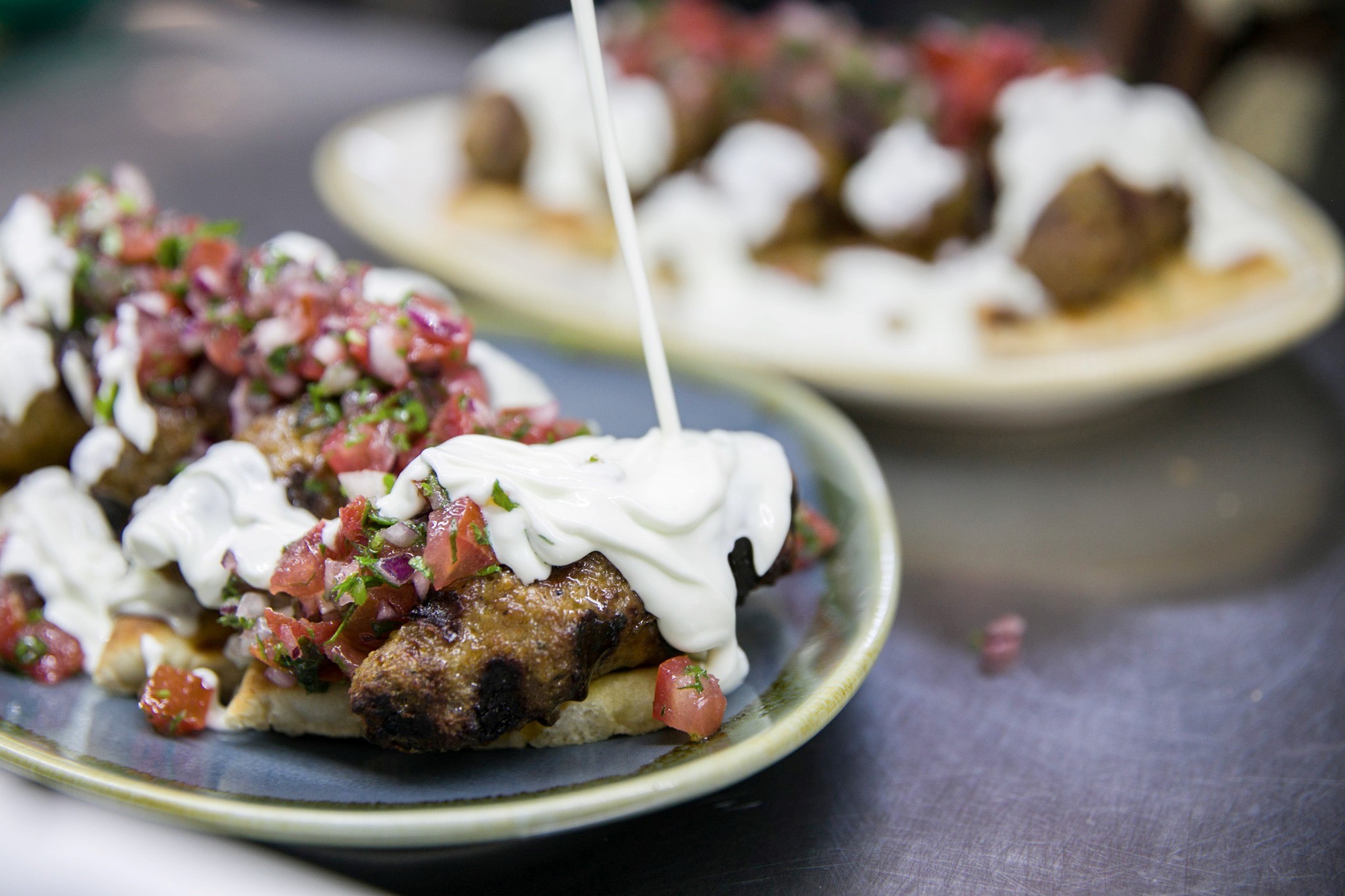 The menu includes dishes made with local meats, such as stuffed zucchini with chicken mince, pork belly, moussaka with oxtail and eggplant (prepared fresh upon order), and pasta with slow-cooked oxtail in tomato sauce.